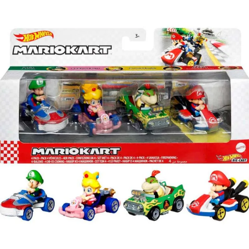 Hot Wheels Mario Kart Set de 4 Vehículos, incluye: Baby Mario, Baby Princesa Peach, Baby Luigi y Baby Bowser<Mattel Hot