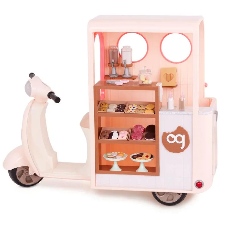 El Set de Vespa Tienda de Galletas de Our Generation incluye una moto y accesorios para simular la venta de galletas. Perfecto para aventuras y juegos de negocio.