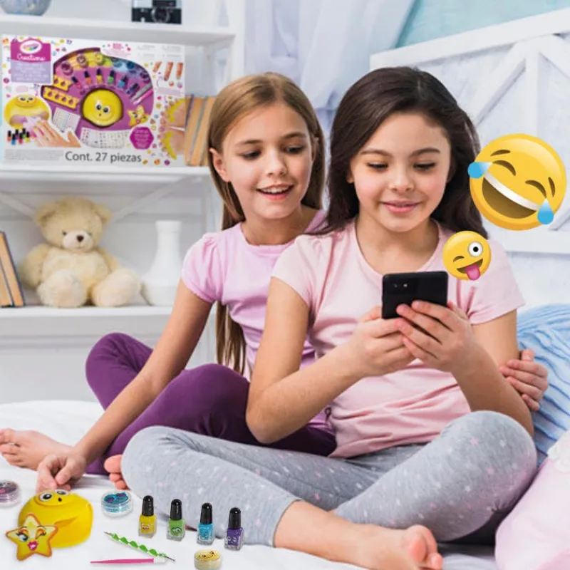 Transforma tus uñas con este salón de uñas temático de emojis. Incluye esmaltes, stickers y herramientas para diseñar uñas con las expresiones más divertidas.