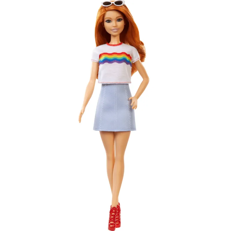 Barbie Diversidad luce una camiseta Rainbow y minifalda, un estilo colorido y alegre. Ideal para quienes desean expresar su individualidad con moda y alegría.