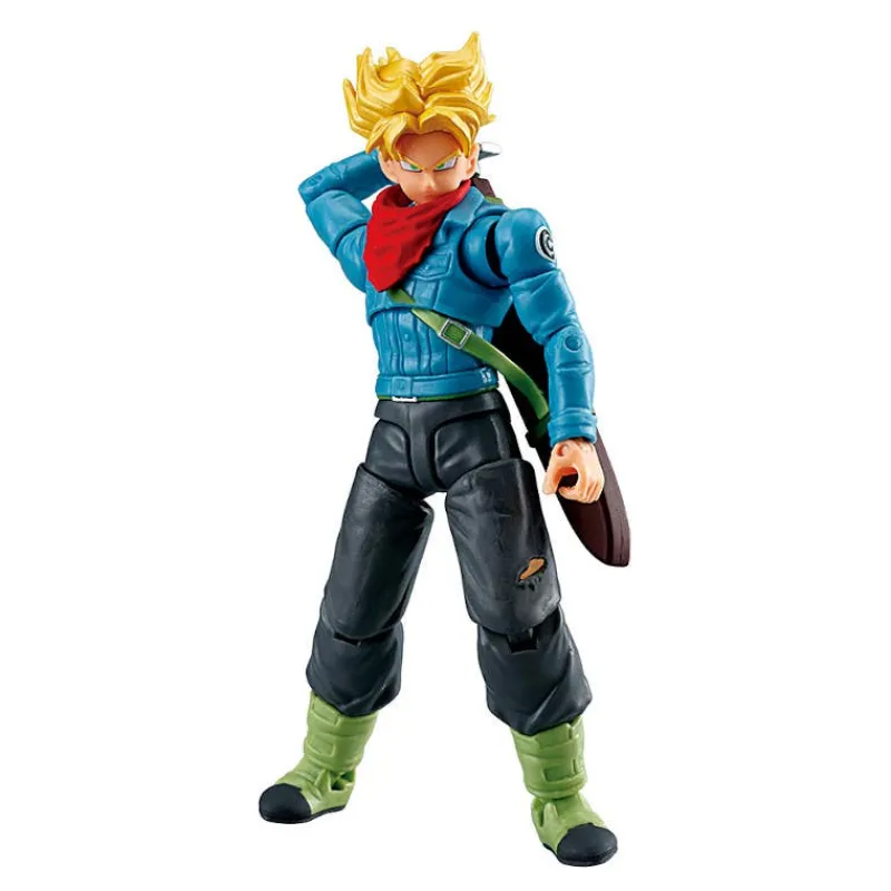 Trunks en una figura de acción de 5″ que muestra su coraje y habilidad con la espada. Ideal para representar sus luchas por la línea temporal y sus aventuras heroicas.