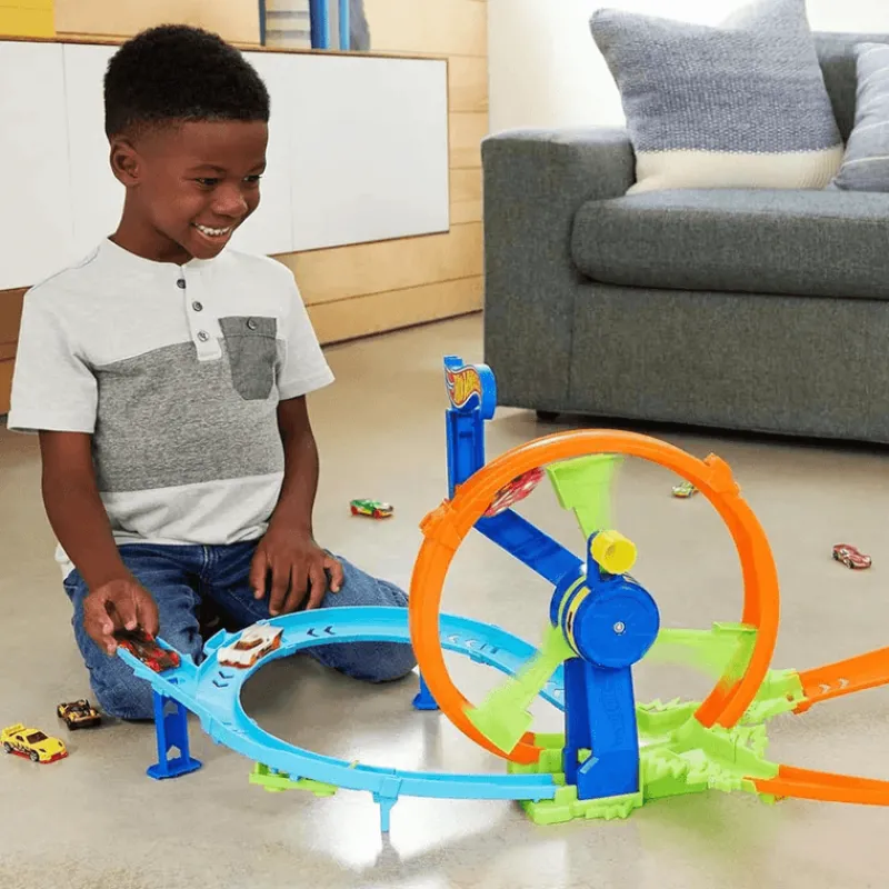 ¡Acelera la emoción! Hot Wheels Action Desafío Turbina de Acción te lleva al límite con una rueda impulsora automática, curvas emocionantes y una zona de choque.