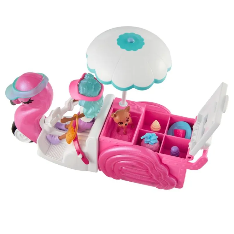 El disfraz Carrito de Bocadillos Flamingo de Polly Pocket agrega un toque de diversión tropical. Perfecto para los pequeños que buscan recrear aventuras con estilo veraniego y refrescante en miniatura.
